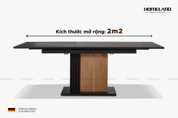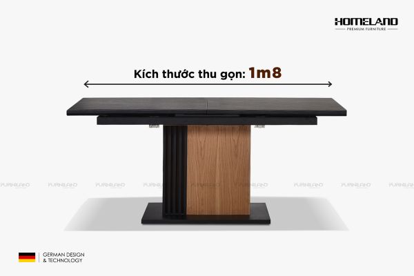 + Chất liệu: Bàn ăn thông minh Tower (kéo giãn) mặt đá nhân tạo gốc thạch anh, chân gỗ óc chó kết hợp thép